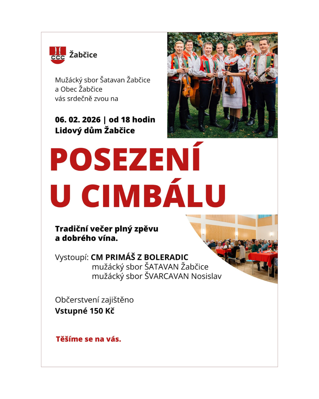 Mužácký sbor Šatavan Žabčice a Obce Žabčice vás srdečně zvou na Posezení u cimbálu dne 6. února 2026 od 18 hodin, kde vystoupí cimbálová muzika Primáš z Boleradic, mužácký sbor Šatavan a mužácký sbor Švarcavan z Nosislavi.